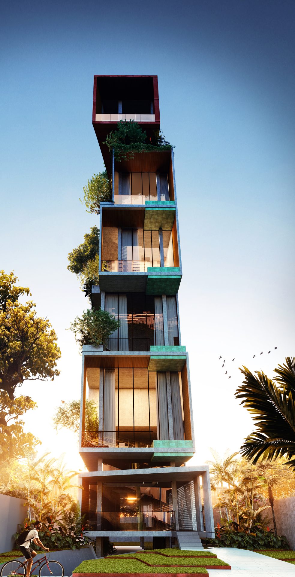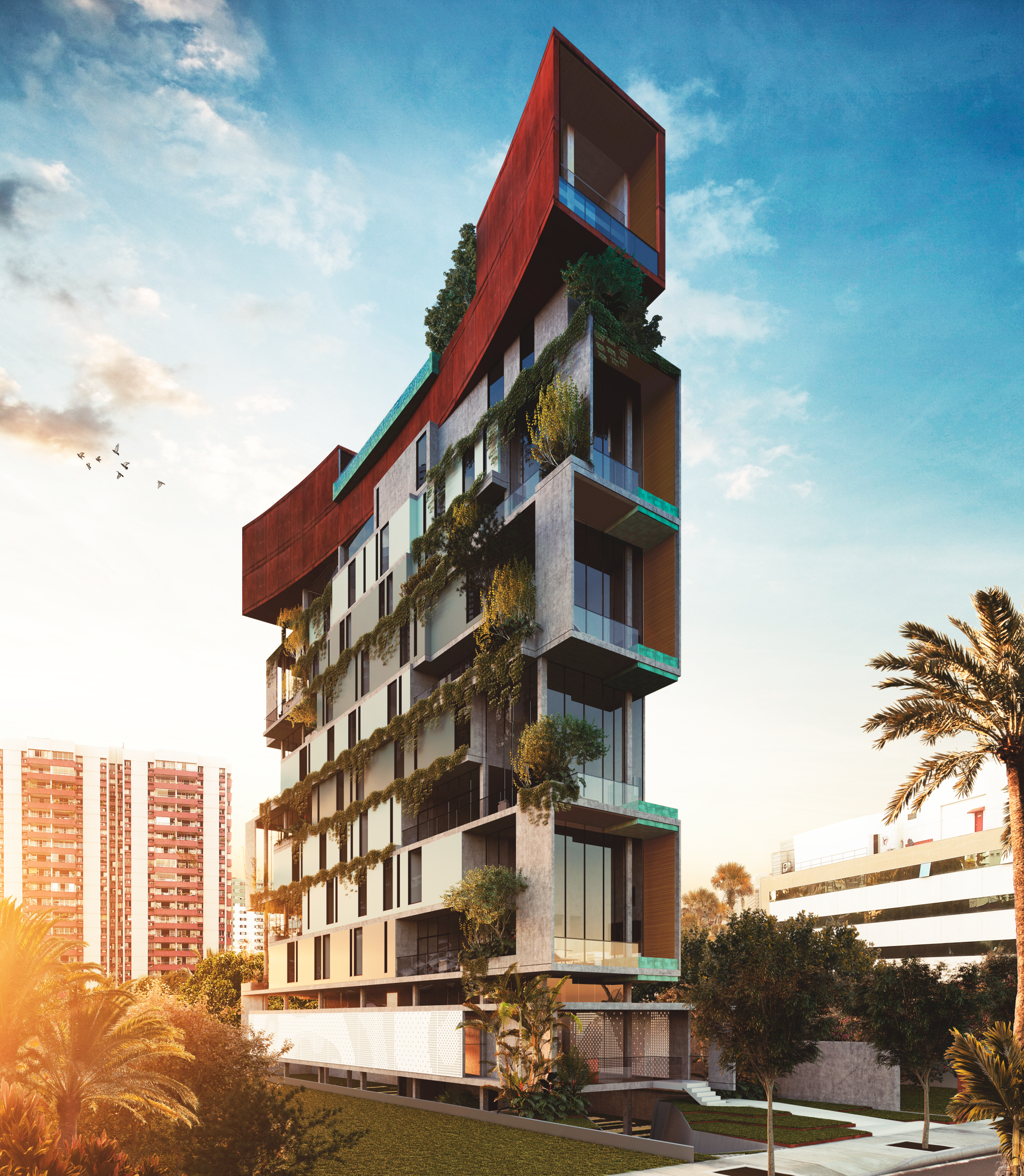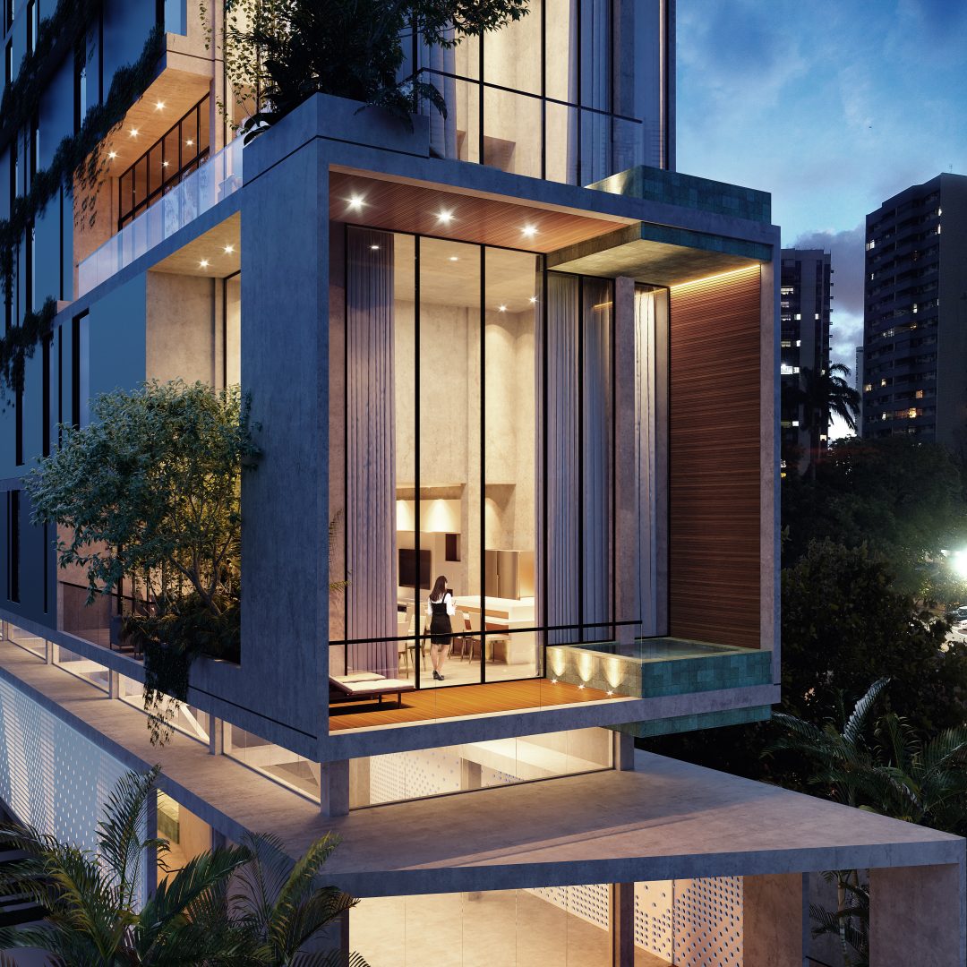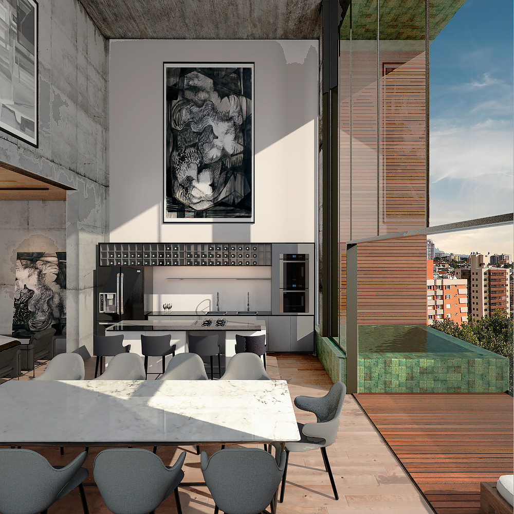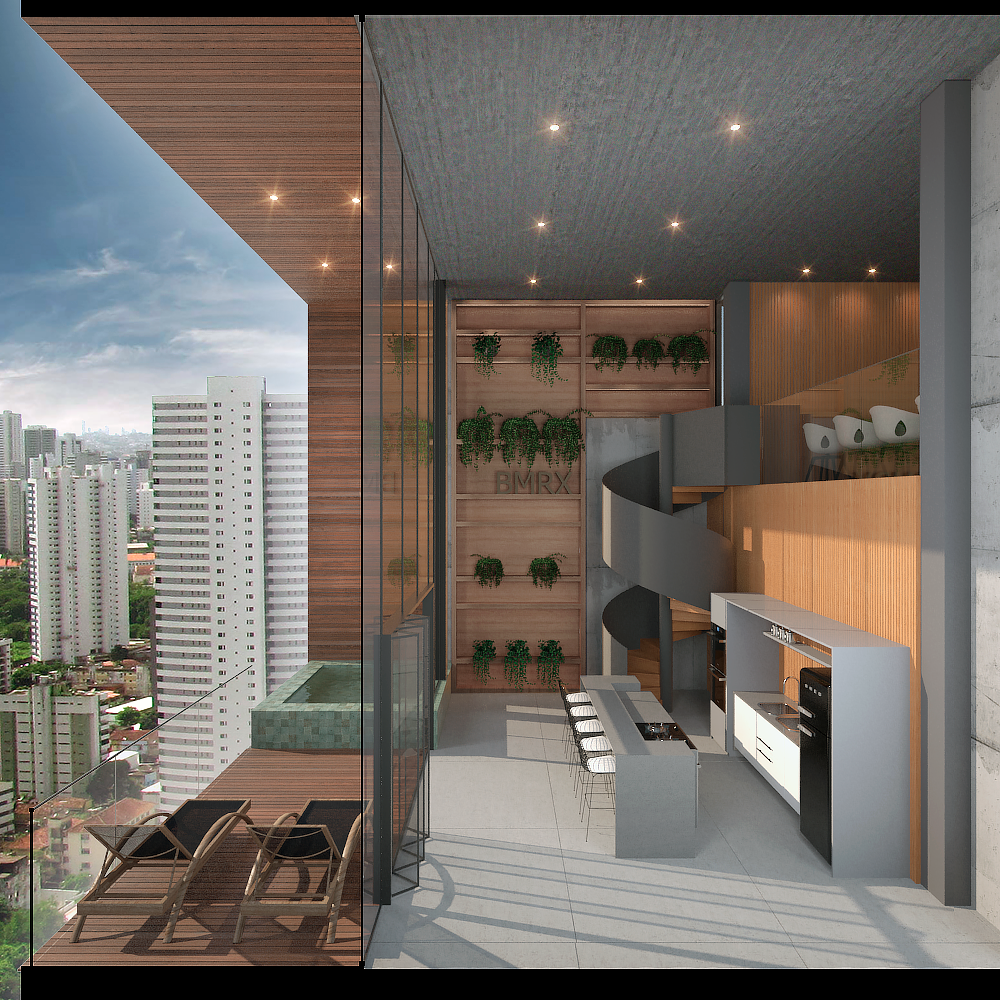 Inspirado em “coberturas empilhadas”, cada apartamento do Loft BMRX conta com piscinas individuais nas varandas e pé direito duplo de 6,00m. As unidades foram projetados como amplas casas, e cada uma tem uma sensação absolutamente única, com vistas privilegiadas para o bairro e apenas 10 unidades no total.