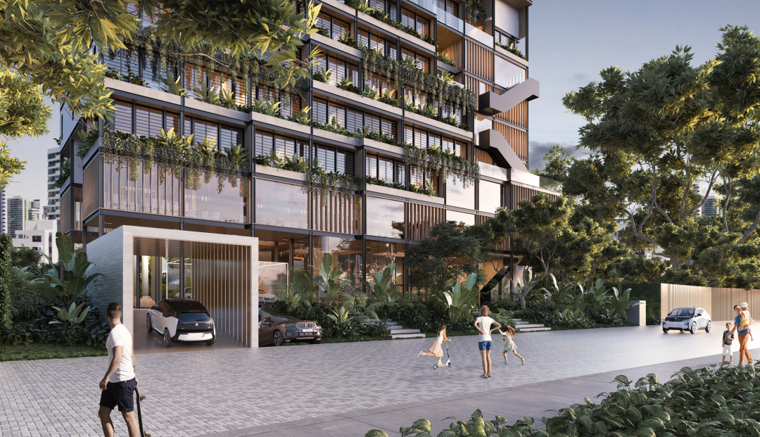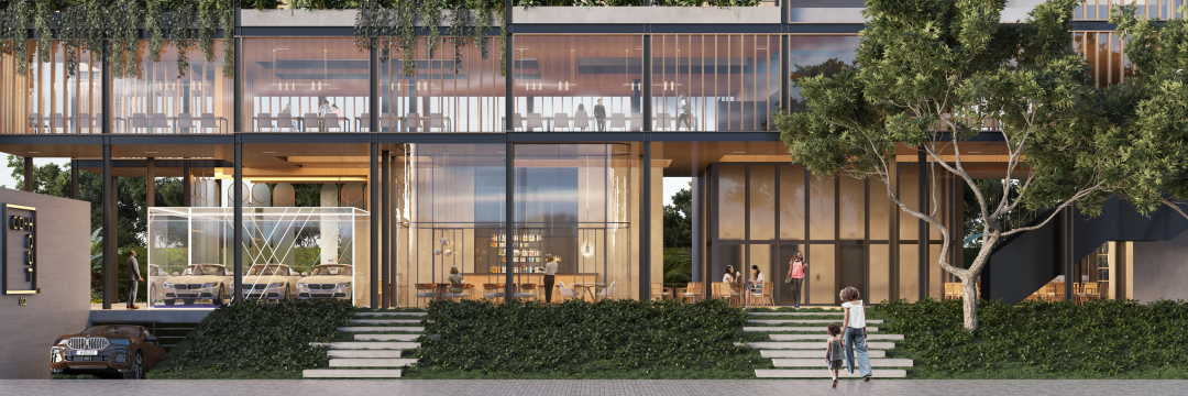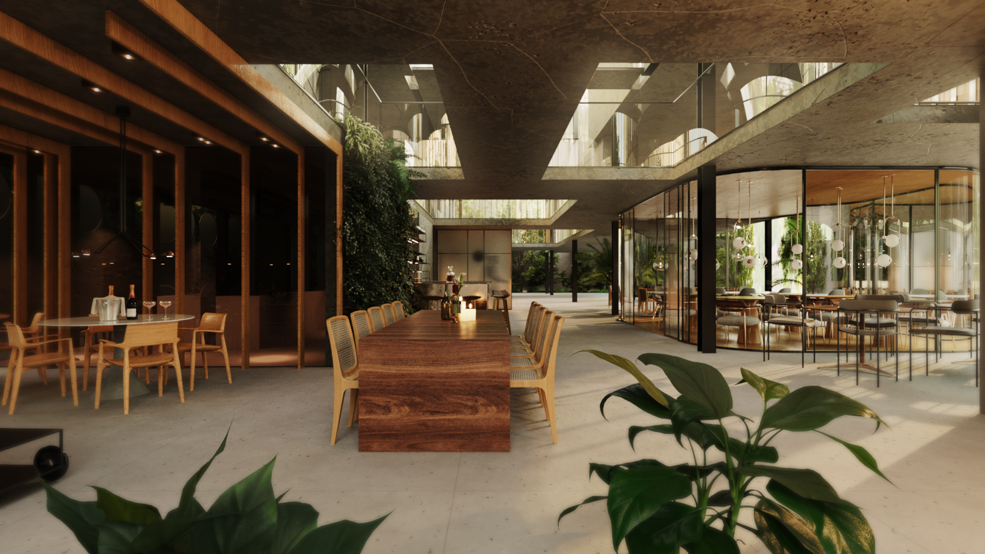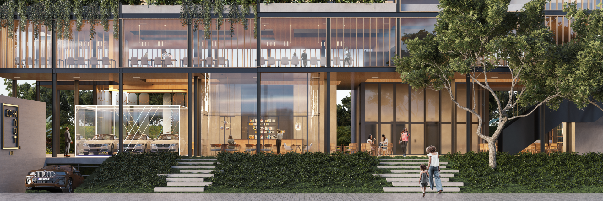 Desde o térreo do edifício, todo aberto para a cidade, valorizando o que a Rua Ana Camelo da Silva tem de melhor – a calmaria, a arborização, um ambiente verdadeiramente agradável – e convidando a vizinhança a viver novas experiências com um bistrô e uma pocket livraria em uma praça que se estende até a rua, assumindo a função de equipamento urbano e requalificando a localização onde está inserido através da gentileza urbana.