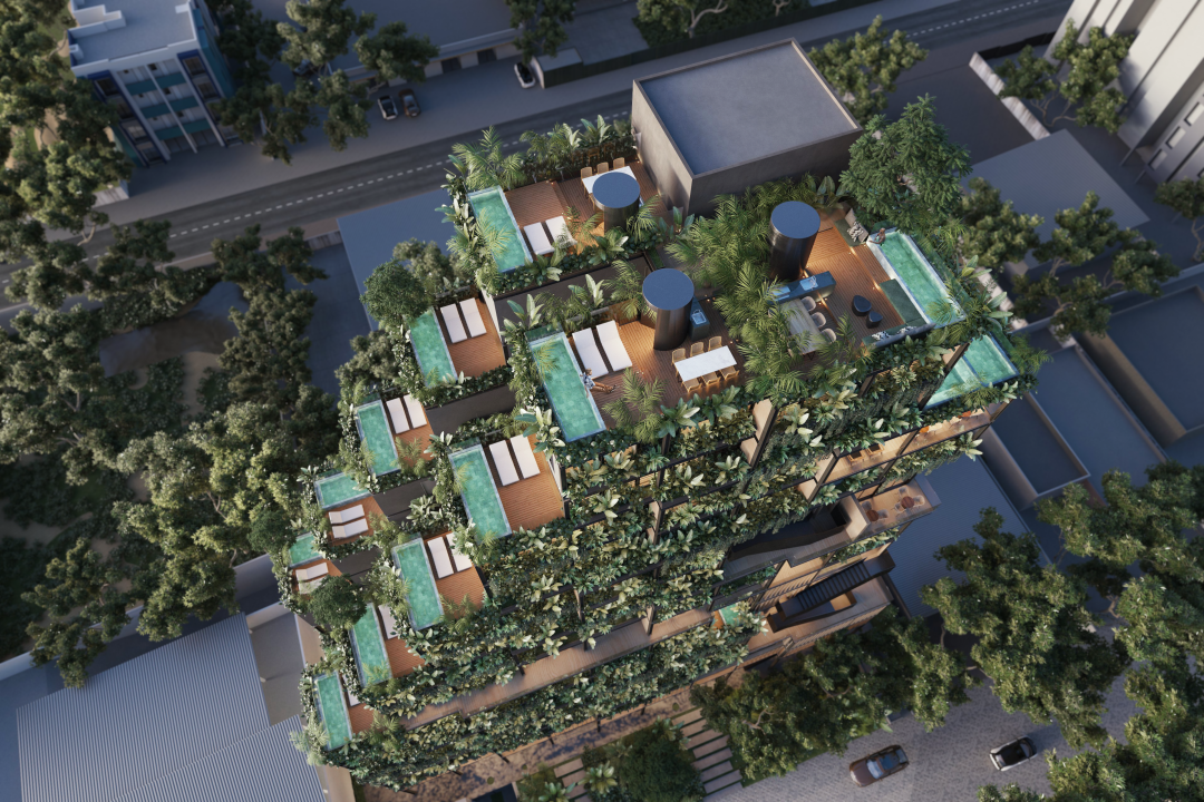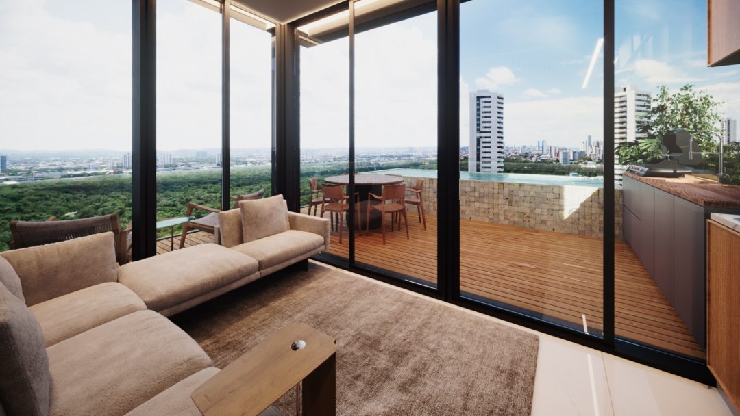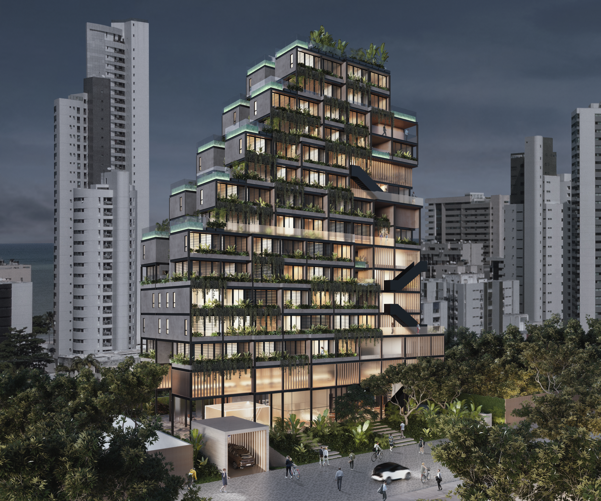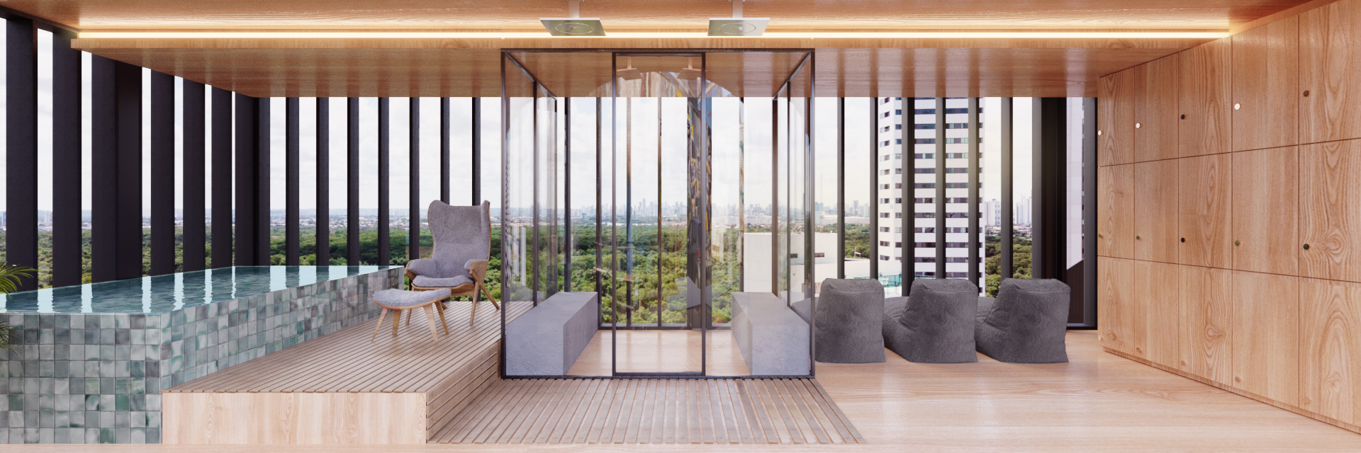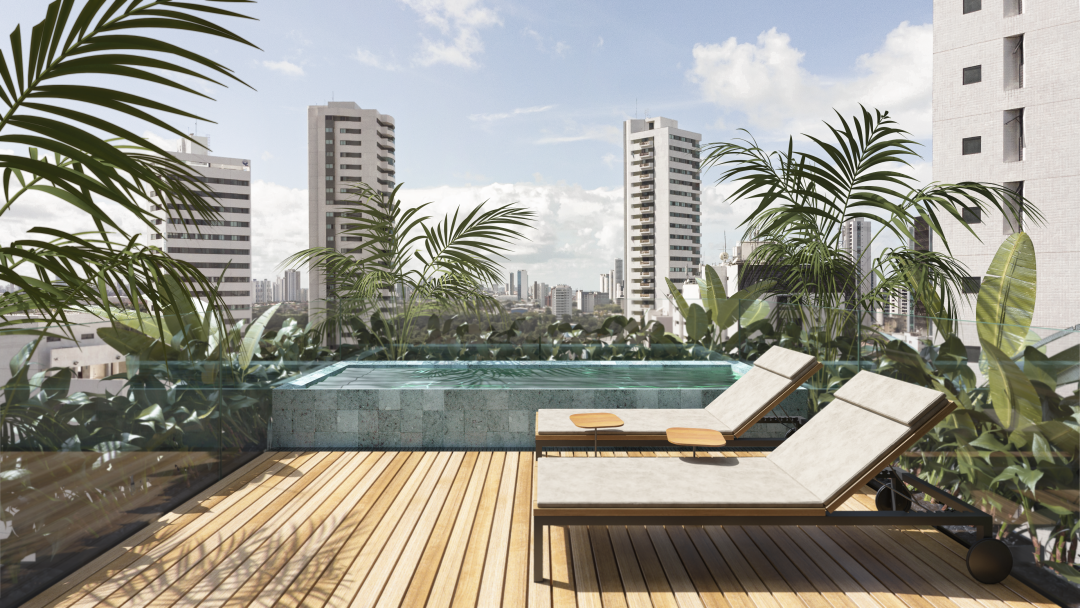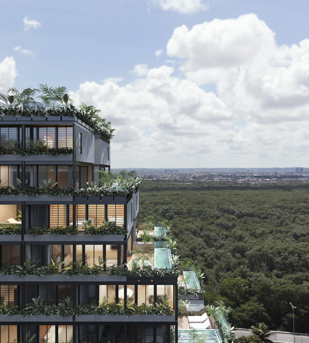 Sua arquitetura se deleita sobre a paisagem de um dos ecossistemas mais bonitos do Recife, o imenso mar verde que é o parque dos manguezais, vista dos nossos apartamentos e áreas comuns espalhadas ao longo do edifício. E, por que não, apartamentos de 40m² com terraço e piscina privativa com esse mesmo plano de fundo? Nos banheiros, janelas que vão do piso ao teto fazem do banho um momento singular. Valorizando a convivência e interação, os espaços comuns estão distribuídos por todos os pavimentos do CO-HAUT 002, proporcionando experiências únicas e fazendo do edifício um organismo pulsante, cheio de vida.